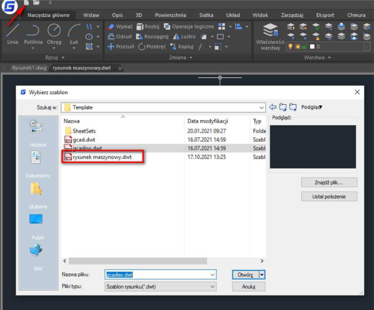 natomiast na liście szablonów widnieje już nasz plik: rysunek maszynowy.dwt