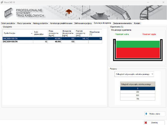 po uzbrojeniu tras kablowych w podpory oraz przebiegi kablowe program wskazuje ewentualne przepełnienie lub przeciążenie