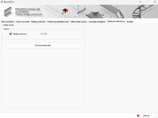 Program umożliwia generowanie zestawienia wszystkich elementów wprowadzonych do projektu włącznie z wymaganą ilością łączników i połączeń śrubowych oraz wszystkich elementów składających się na podpory. Posiada możliwość wprowadzenia tabeli z zestawieniem elementów bezpośrednio na rysunek projektu lub do pliku XLS.