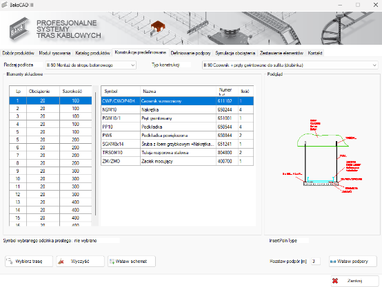 Możliwość wprowadzania do projektu podpór tras kablowych oraz definiowanie elementów podpór na dwa sposoby. Za pomocą pojedynczych detali wybieranych z wszystkich dostępnych elementów katalogowych lub poprzez wykorzystanie konstrukcji predefiniowanych skompletowanych dla odpowiedniego typu trasy kablowej. Dodatkowo szybkie wstawianie do projektu opisów elementów składających się na podporę i schematycznych przekrojów podpór dla konstrukcji predefiniowanych.
