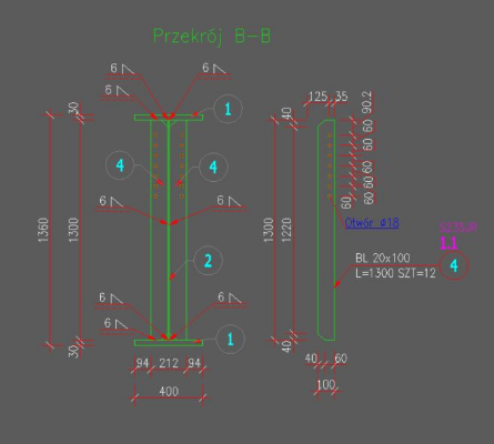 Zmiana położenia opisu el. stalowego – polecenie pozwalające w dynamiczny sposób przestawić opis el. stalowego, uwzględniające wszystkie elementy opisu oraz przy zachowaniu położenia grotu,