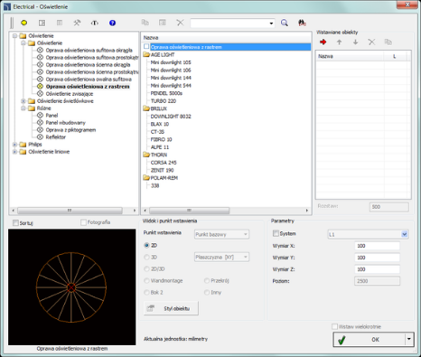 Biblioteka Oświetlenie zawiera obszerną bazę różnego rodzaju opraw oświetleniowych.