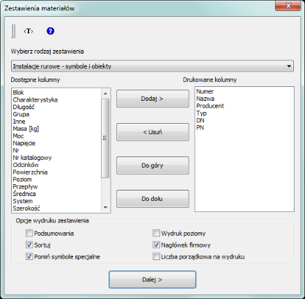 Zestawienia materiałów – polecenie służy do tworzenia zestawień z elementów użytych na rysunku.