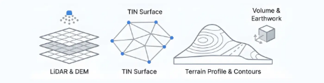 Modeluj i analizuj teren za pomocą powierzchni TIN, LiDAR i narzędzi DEM. Generuj kontury,