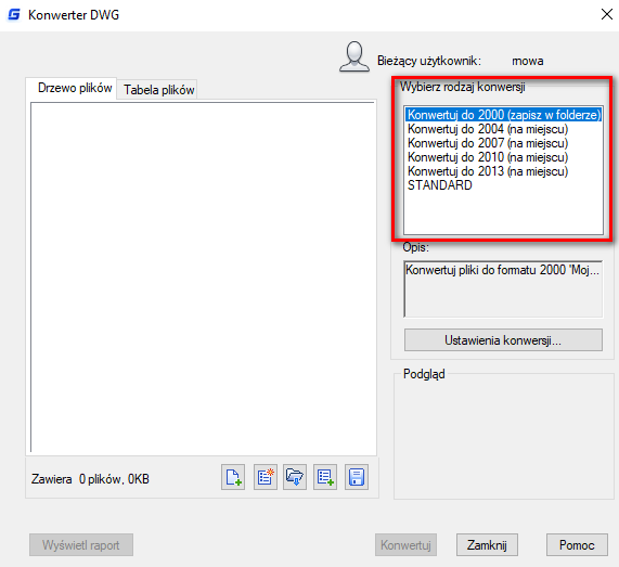 Po prawej stronie okna dialogowego wybierasz wersję (od 2013 do 2000 r.), na którą chciałbyś przekonwertować plik lub kilka plików jednocześnie (dodanych za pomocą ikonek na dole ww. okna).