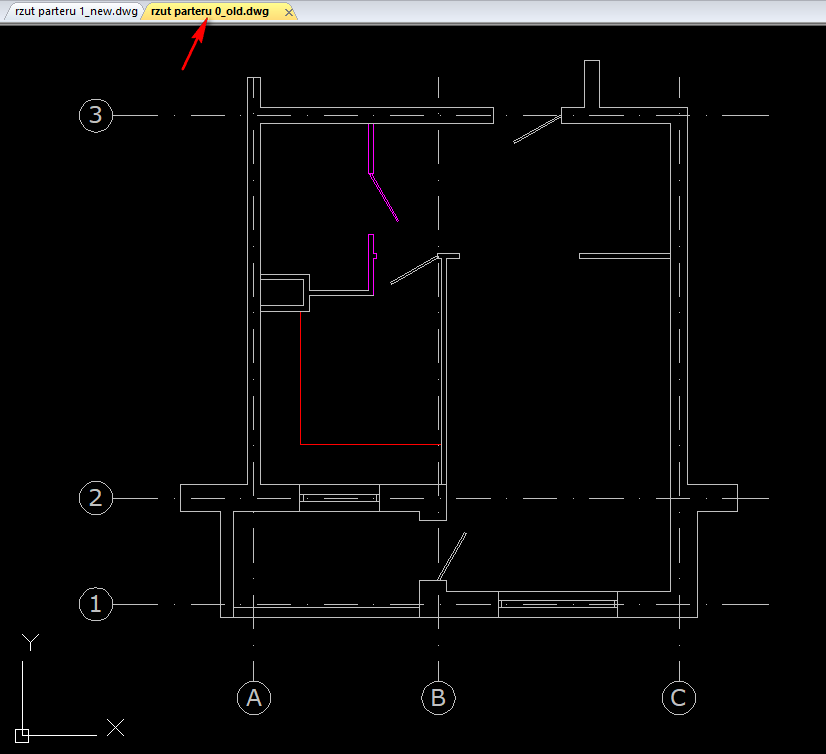 Parteru 1.dwg, w którym skasujemy szarą linię zabudowy meblowej w kuchni oraz