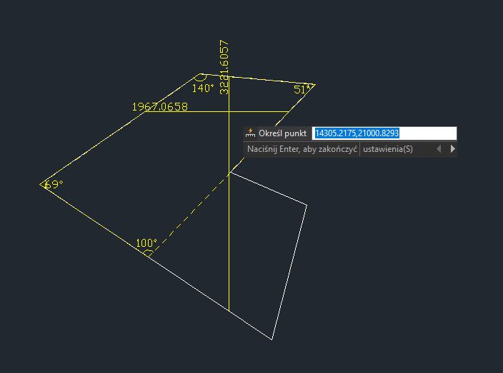Program automatycznie, żółtym kolorem pokaże wszelkie wymiary kątowe elementów najbliżej miejsca postawienia kursora myszki, współrzędne celownika myszki w danym momencie, dodatkowo podając graficznie geometrię, którą tworzą zamknięte pola naszego wrysowanego obiektu (linie przerywane).